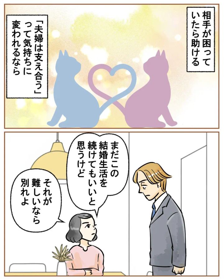 「相手が困っていたら助ける。『夫婦は支え合う』って気持ちに変われるなら、まだこの結婚生活を続けてもいいと思うけど、それが難しいなら別れよ」と別れをツカサに突きつけました。