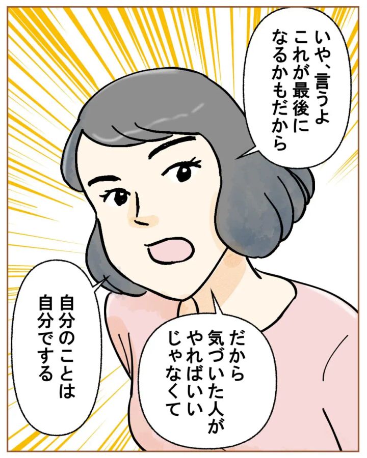「いや、言うよ。これが最後になるかもだから。だから気づいた人がやればいいじゃなくて、自分のことは自分でする」そうキッパリ言った後、