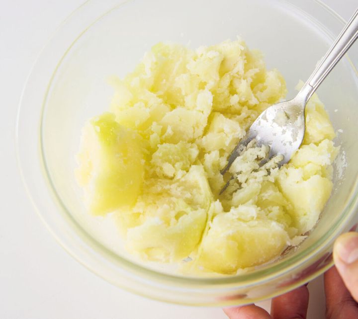 レンチンした後、あえてざっくりと粗くつぶし、ごろごろ感を残すのがおいしく仕上げるコツ。ペースト状になるまでつぶしたものに比べ、じゃがいものほくほくした食感が残ります。また、熱いうちにつぶしたほうが柔らかく、粘りも出にくいので、好みの加減に仕上げることができます。