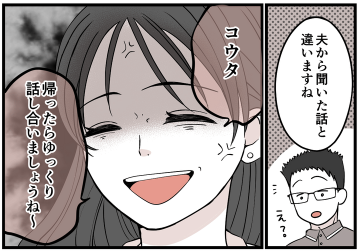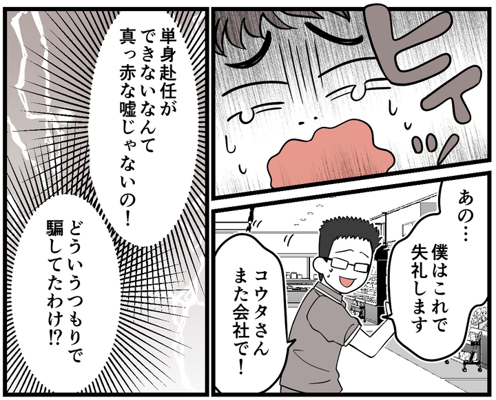 ハマダさんが会社の転勤事情を詳しく話してくれました。その内容はコウタが言っていたことと大きく違います……。私は怒りをその場では堪えながら相づちをうっていました。