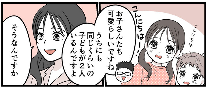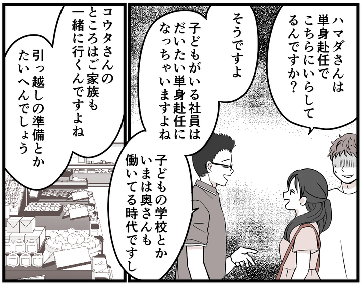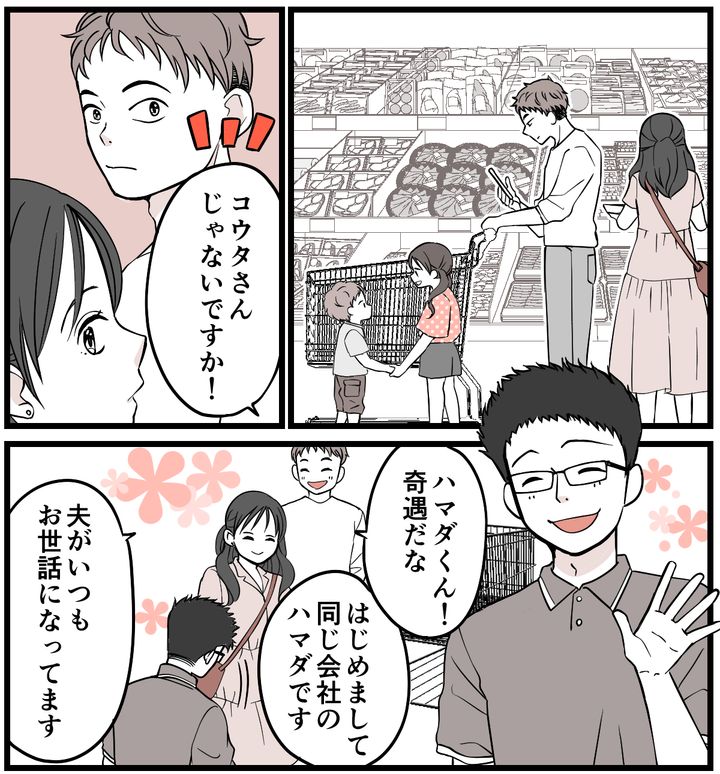週末になり、私たちは家族4人でスーパーへ買い物に行きました。転勤の話が落ち着かず、コウタとは相変わらず険悪でしたが、子どもたちの前ではそれを見せないようにしなくてはいけません。カートを押しながら、家族で和やかに買い物をしていました。そこへ偶然居合わせた同僚のハマダさんが声を掛けてきてくれました。