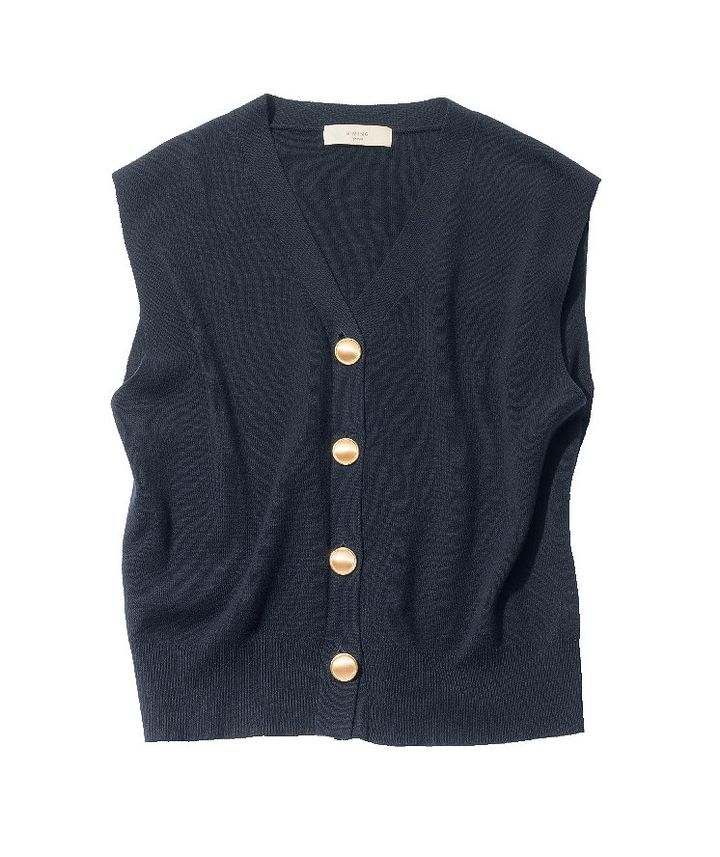 Tシャツ×パンツのシンプルコーデに、さらりとニットジレを重ねてきちんと感&季節感をプラス。残暑の日は半袖をベースに、秋本番になったら長袖に。気温が不安定な10月のコーディネートに頼れる存在です。大きめボタンがアクセントになり、シンプルコーデを即お洒落に格上げ。