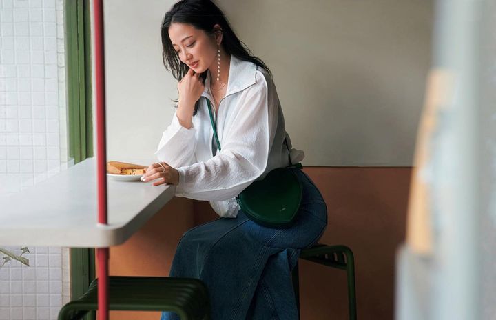 シアーブルゾン¥24,200(ストラ)タンクトップ¥7,700(THIRD MAGAZINE × FRUIT OF THE LOOM/THIRD MAGAZINE)デニムスカート¥33,000(ウィム ガゼット/ウィム ガゼット 玉川髙島屋S・C店)バッグ¥24,200(ヤーキ/ヤーキ オンラインストア)ピアス¥29,700ネックレス¥29,700リング¥16,500(すべてリューク)