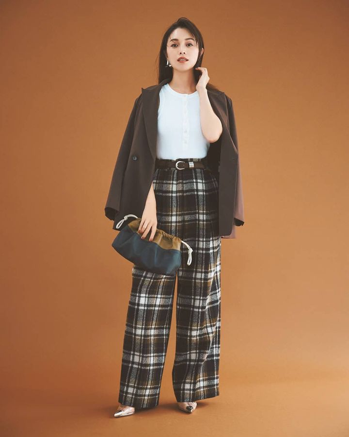 シンプルで直線的なシルエットのビッグジャケットは、トレンドカラーでもある柔らかなブラウンで女らしい余裕をプラス。凛とした雰囲気が漂いつつも、中は白リブで抜け感を作って堅苦しさを回避。オンオフ問わず頼れる一枚です。