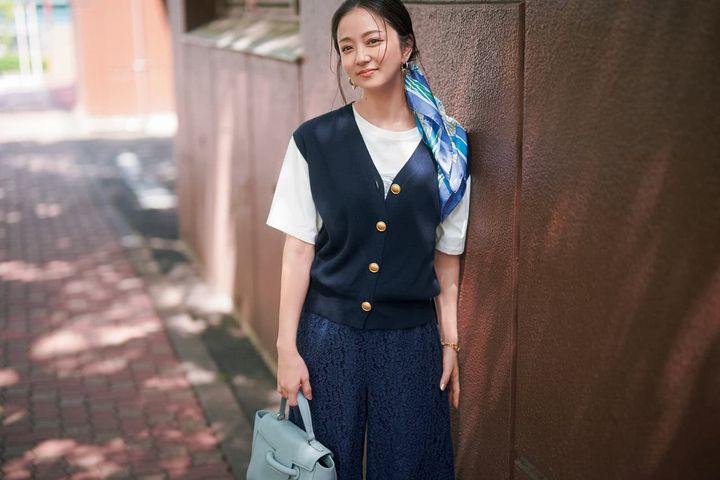 ニットジレ¥6,490(ビーミング by ビームス/ビーミング ライフストア by ビームス ららぽーとTOKYO-BAY店)Tシャツ¥3,990(アンフィーロ)レースパンツ¥34,100(THE TINY BIG SISTER/THIRD MAGAZINE)バッグ¥55,000(ヴァジック/ヴァジックジャパン)スカーフ¥22,000(マニプリ)ピアス¥39,600ブレスレット¥34,100(ともにローラ ロンバルディ/八木通商)