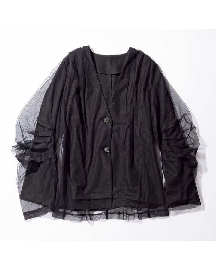 スーツ素材にチュールをレイヤードしたジャケットはオシャレ感度の高いアイテム。これ1枚羽織れば今見えは完璧です。袖の部分や肩にタックを寄せてチュールが際立つように仕上げています。ジャケットでも自宅でのお手入れが可能です。今シーズン一押しのノーカラージャケットです。