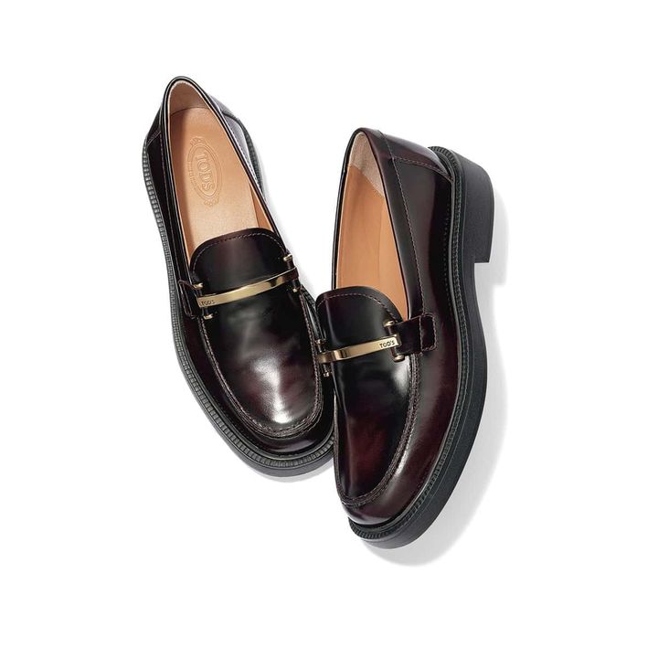 もはやタイムレスな名品、“トッズのローファー”。艶感のある滑らかなレザーにゴールドのバレッタが映えて、圧倒的な高級感。カジュアル感高めなタンクトップ×スウェットコーデも、一気に上品な印象に。秋らしいボルドーは、旬なだけでなく白にも黒にも似合う機動力も嬉しい。