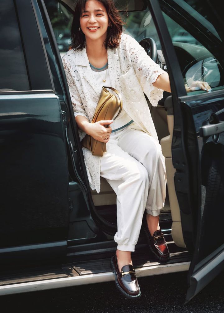 ローファー〈ソール高3㎝〉¥127,600バッグ¥289,300(ともにトッズ/トッズ・ジャパン)シャツ¥38,500(THIRD MAGAZINE)レイヤードタンクトップ¥8,800(メゾンスペシャル/メゾンスペシャル 青山店)スウェットパンツ¥26,400(ティッカ)ピアス¥38,500ネックレス¥27,500リング¥26,400(すべてプラウ)