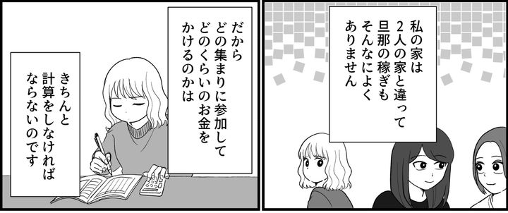 私はスミレ(30)。マイコ(29)やナミ(30)とは子ども同士仲が良いので、他のママ友と同じようにタイミングが合えば遊んでいました。ママ友の付き合いは、お金がかかる遊びなども多くそのすべてに付き合っていられません。だから、そのときに私や子どもが遊びたい人を優先させたり、お財布の事情を見たりしながら決めていました。私は別に、子どもが毎日友だちと遊ぶ必要はないと思っています。家で一緒に勉強をしたり、テレビを見たり、そういう時間も必要です。