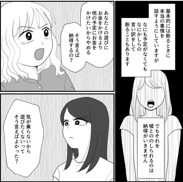 私の場合、遊びに誘われたとしても、金銭的事情や、自分の時間を大切にしたいという想いもあるのでそういう理由でやんわり断ることがありました。ママ友に自分の気持ちをいちいち正直に話す必要もないと思うのです。言わなくていいことは言わず、配慮をした言い方をしていたつもりなのにマイコに嘘つき呼ばわりをされ、とてもガッカリしました。