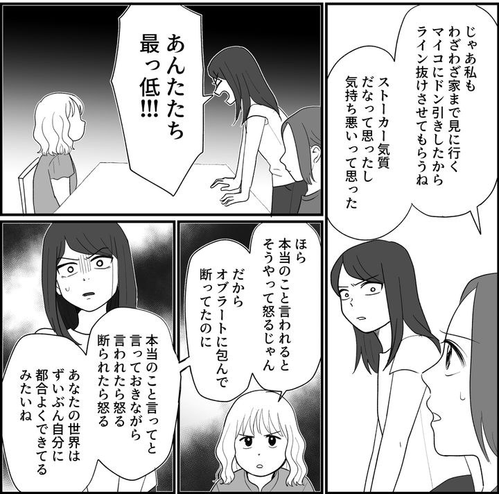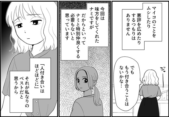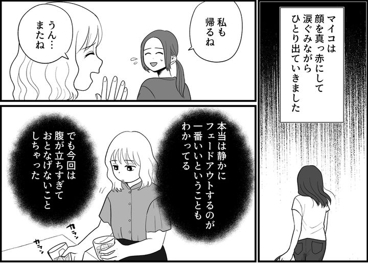 マイコは顔を真っ赤にして、涙ぐみながらひとりで出ていきました。私はマイコの奴隷ではありません。自分の大事な生活があるのに、なんでも二つ返事でマイコに合わせることはできないのです。それにもう立派な大人。相手に配慮して言葉を選ぶのも、当たり前のことですよね。