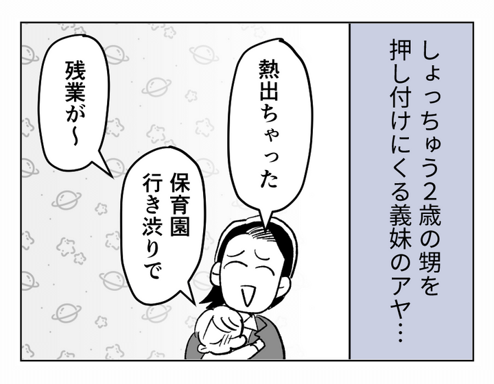 義実家で敷地内同居をしているチサトさんは、家族との時間をしっかり取りたいと考えパート勤務をしています。しかし、そんな日常を脅かしているのが近所に住んでいる義妹さん。なかなかやっかいな人のようですね。断っているのに何度も甥っ子くんを預けられ続けているそうです。そしてチサトさん親子にとって大切な日だというのに、またもや甥っ子くんを押しつけられてしまいました。発熱している甥っ子くんの健康と安全に配慮しつつも、娘さんとの約束は守りたいと強く願うチサトさん。彼女がいったいどんな行動に出るのか……今後が気になりますね。
