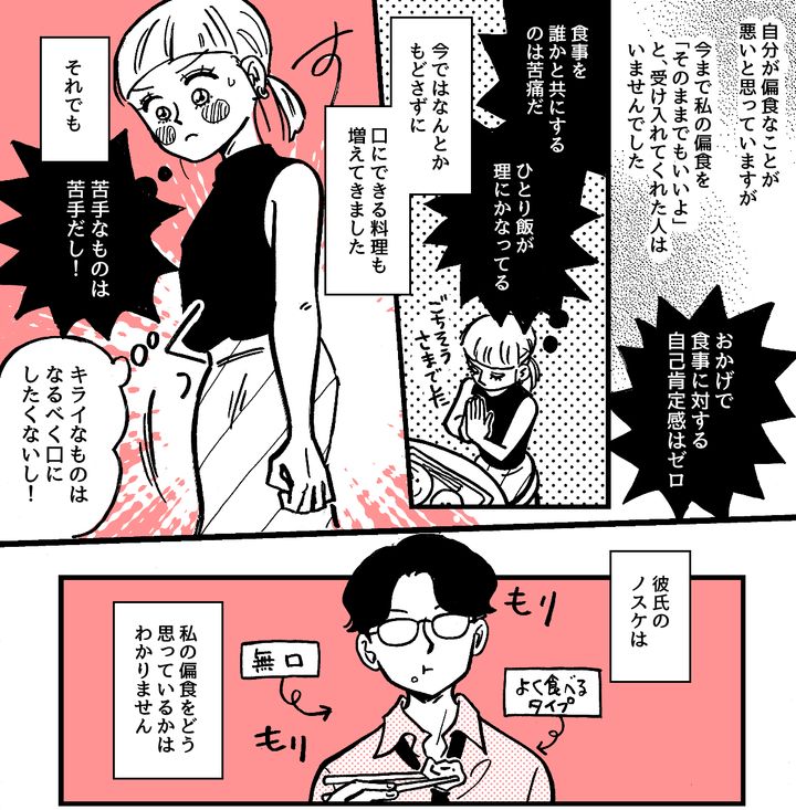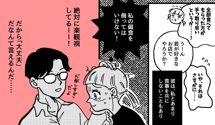 私はシオン(26)。物心がついた頃からひどい偏食でした。親や親戚はもちろん、友人や上司にも毎回注意され、呆れられ、ついには元カレにも偏食が原因でふられてしまいます。私も偏食をなくそうと努力はしたのですが、もどしてしまったりしてどうしても食べられないのです。現在の彼氏ノスケ(30)には私の偏食のことは話していますが、私はもう誰かと一緒に食事をとることが苦痛なので、あまり一緒に外食をしないようにしています。