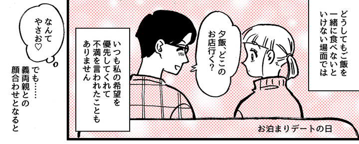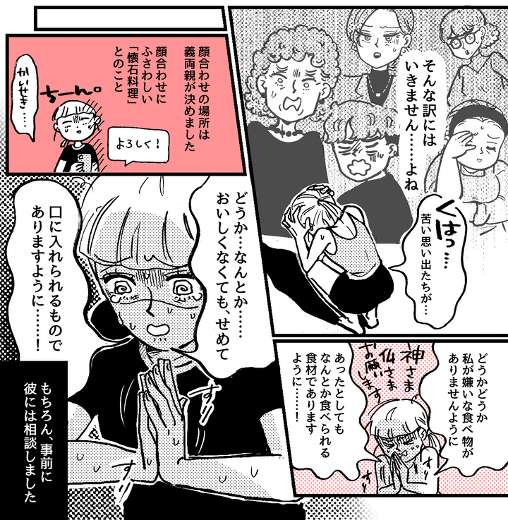 いままで私の偏食に理解を示してくれていたノスケですが……義両親とはまた別の話。顔合わせの食事会がいまから憂鬱でなりません。場所は懐石料理屋さん……義両親がお店を決めてくださいました。不安な気持ちをノスケにも相談したら「俺が全部食べるよ」とは言ってくれたのですがやっぱり当日を迎えるのが怖くて仕方ありません。