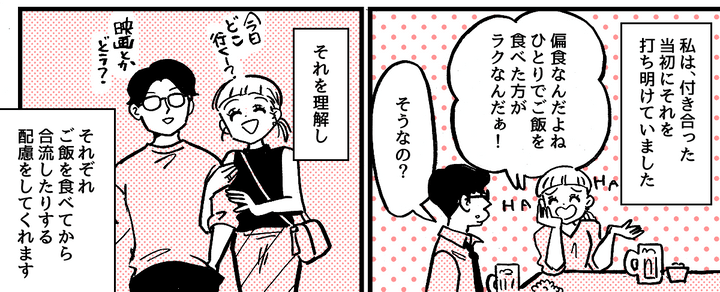 ノスケには早い段階で私が偏食で、人と食事をすることが苦手なことは伝えてありました。そのため、デートのときは基本的にお互い食事を済ませてから集合。お泊まりデートのときなど状況的に一緒に食事をするしかないときは、ノスケが私の好みに合わせた食事をしてくれたりと配慮をしてくれていたのです。