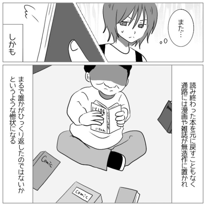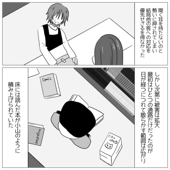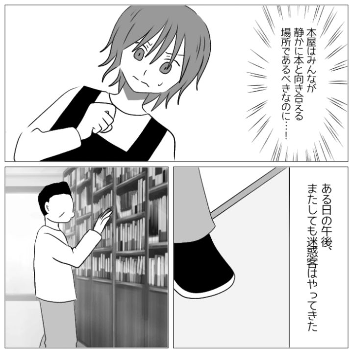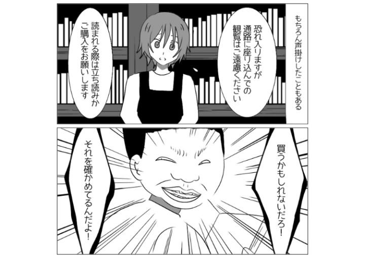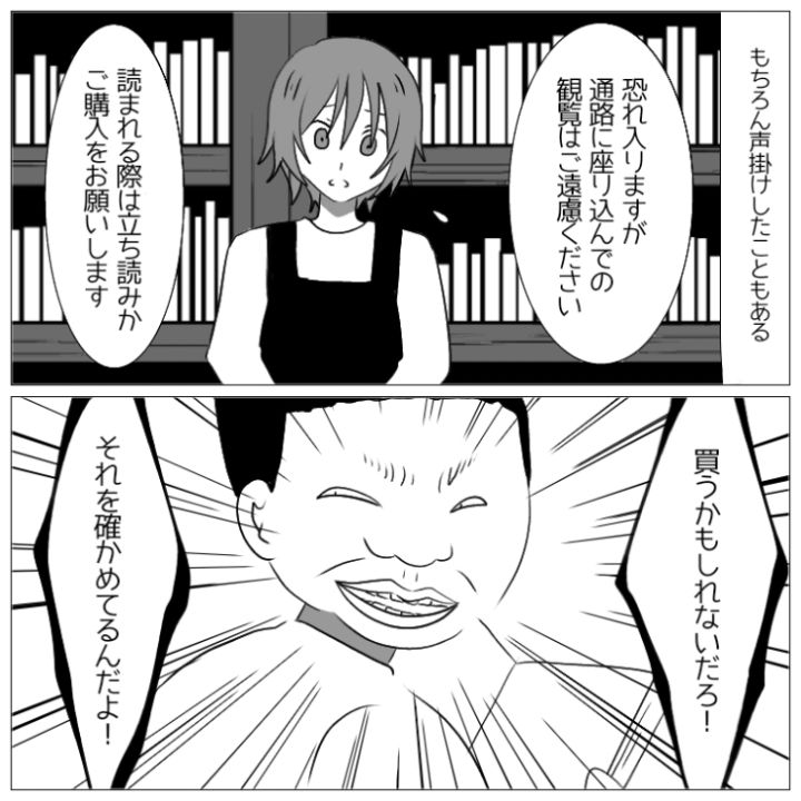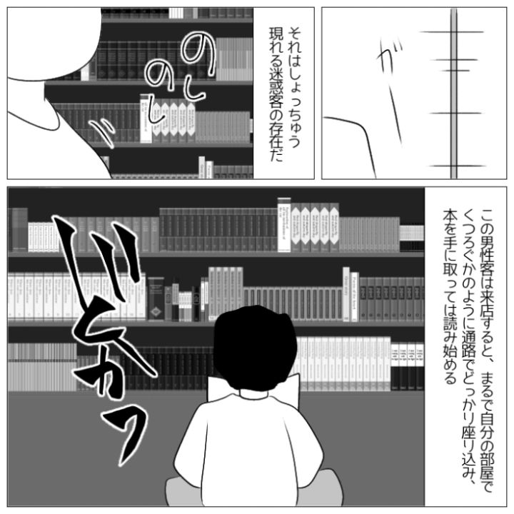 衝撃のエピソードを漫画化!今回は本屋でまるで自宅でくつろいでいるときのように床に座って購入前の本を読み漁る迷惑客のお話をご紹介します。