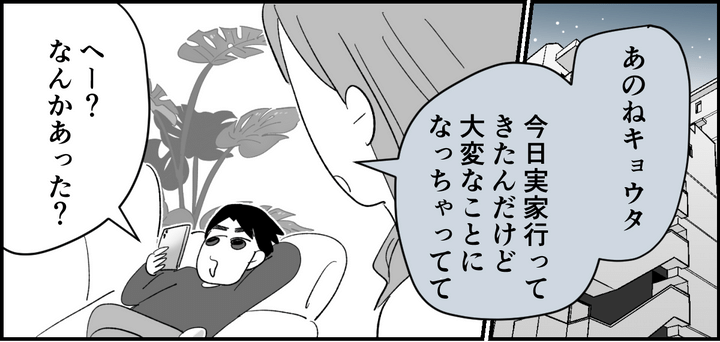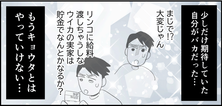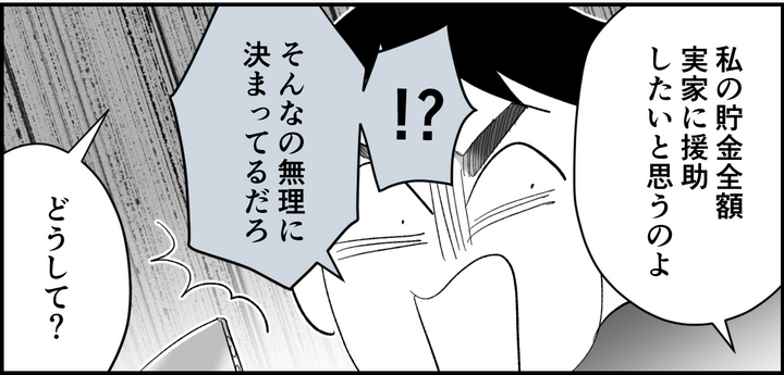 優雅に寝転び、適当な相槌を打っていたキョウタですが「貯金全額、実家に援助したいと思う」私のこのひと言にキョウタはサッと顔色を変えました。