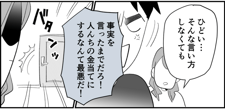キョウタは苛立たしげに自室へと向かい、バンッ! と音を立ててドアを閉めました。これが決定打、私の決意は固まったのでした。(ああ、もう無理だ……。キョウタとはやっていけない)