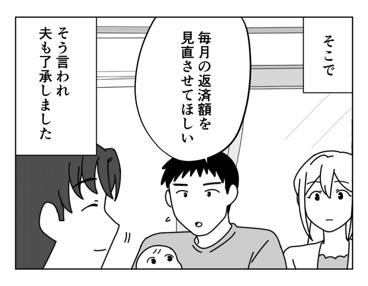 ミズキさんの兄・ケイシさんは、ミズキさんの夫から借金をしています。ケイシさんはずっと借金のことを妻のエリナさんに隠し続けてきました。しかし返済のためムリをして働き、過労で倒れてしまい、とうとうエリナさんに知られてしまいます。しかしエリナさんはまったく動揺せず、それどころか今後の返済について的確なアドバイスをくれたのでした。