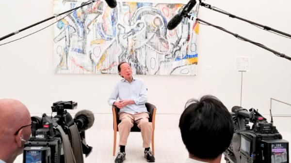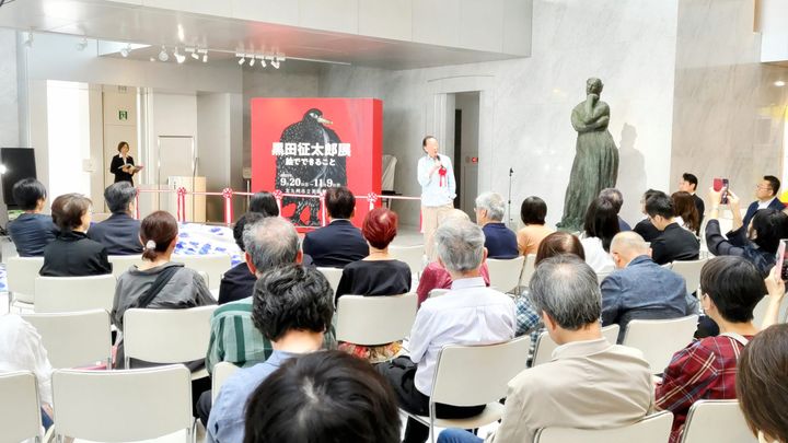黒田征太郎さんは、1939年大阪生まれの、国内外で活躍されている画家・イラストレーターです。2009年からは、北九州市の門司港を拠点として活動されています。今回の企画展は、86歳にして初となる大規模個展だそうです。オープニングセレモニーでは、報道関係者や招待客の方々がたくさん集まり、武内市長も来席され、挨拶を述べられていました。セレモニーの最後は、黒田さんからの感謝の言葉、「ありがとう!!」がエントランスホールに響きわたりました。