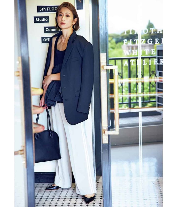 3. 【40代のお仕事コーデ】光沢感でさらに進化!最旬ラインパンツで余裕を醸す