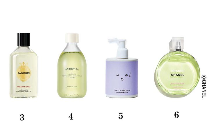 3.パンピューリ ミルクバス&ボディオイル アンダマンセイルズ ¥9,680 4.アロマティカ アウェイクニング ボディオイル ペパーミント & ユーカリ ¥2,970/コスメキッチン 5.soel LIVING-OIL ボディセラム サンダル ウッドオリス ¥4,400/コスメキッチン 6.シャネル チャンス オーフレッシュ ボディ オイル 150㎖ ¥18,480