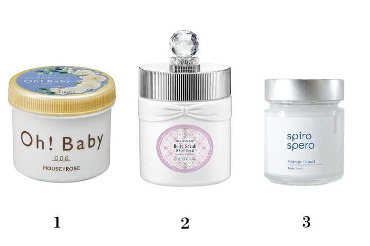 1.ハウス オブ ローゼ ボディ スムーザー WR 350g ¥1,760 2.ジルスチュアート ホワイトフローラル ボディスクラブ 410g ¥4,400/ジルスチュアート ビューティ 3.spiro spero esola ボディスクラブ ミッドナイトウブド 200g ¥3,960 /コスメキッチン
