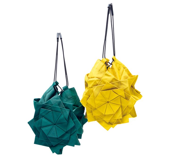 〈132 5. イッセイ ミヤケ〉から、折り紙のようなデザインが印象的なバッグを。マチがあり、物を入れると花のように立体的に広がるのが特徴。畳むと薄くなるので、鞄の中にコンパクトに収納できる。マットな質感とくすみがかった落ち着いた色みは、和装、洋装問わず、合わせやすい。写真のマスタードとグリーンのほか、ボルドーも。