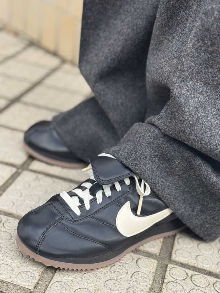「ナイキのスニーカー『コルテッツ』はクラシックなディティールが特徴ですが、これは柔らかなレザーを使用している珍しいデザインがお気に入り。スタイリングによっては重たい印象になってしまうブラックのシューズですが、ガムソールになっていてほどよいヌケ感があるのもポイントです」ナイキのスニーカーは本人私物