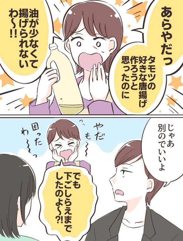 キッチンに戻ったタモツのお母さんは「あらやだっ」と急に慌て始めました。「タモツの好きな唐揚げ作ろうと思ったのに油が少なくて揚げられないわ~!!」と。栄養の偏りを心配してくれて、唐揚げ。ちょっとだけそう思いましたがもちろん黙っていました。「じゃあ別のでいいよ」というタモツに「でもしたごしらえまでしたのよ~!?」と、やけにおおげさに困ったわ~と騒いでいます。