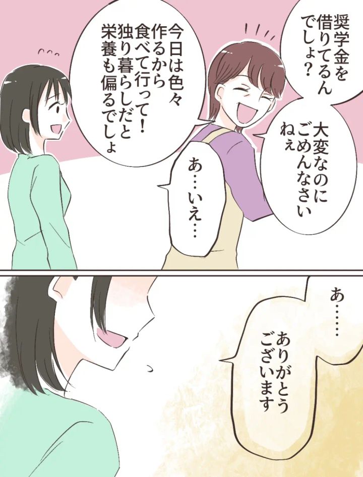 タモツのお母さんは、「奨学金を借りてるんでしょ?大変なのにごめんなさいねぇ。今日は色々作るから、食べて行って!ひとり暮らしだと栄養も偏るでしょ」と笑顔で言ってくれましたが、なんとなく心に引っかかるものが否めませんでした。