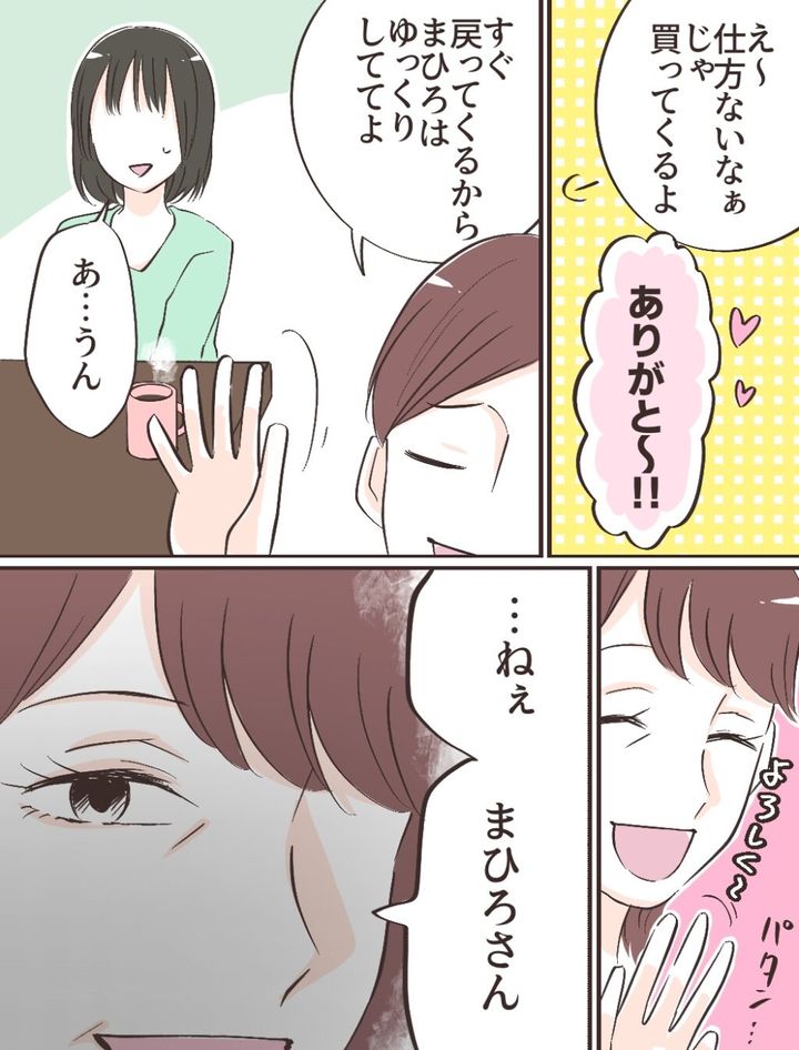 お母さんにそうまで言われてタモツは「仕方ないなぁ、買ってくるよ」と、私にはゆっくりしてて、と言い残して油を買いに出かけました。「ありがとう~」と嬉しそうに見送ったお母さんでしたが、ぱたんとドアが閉まった瞬間、「・・・ねぇまひろさん。」と振り返ったお母さんの明るい笑顔が急に変わりました。
