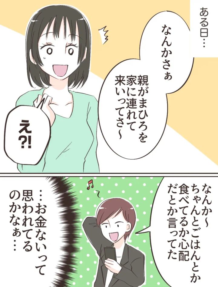 ある日、私は突然タモツの実家に招待されて驚きました。「なんかさぁ、親がまひろを家に連れてこいってさ~」と、対して気にもしていなさそうなタモツですが、「ちゃんとご飯とか食べてるか心配だとか言ってた」という言葉を聞いて、私はお金がないって思われてるのかなぁとなんとなく感じました。