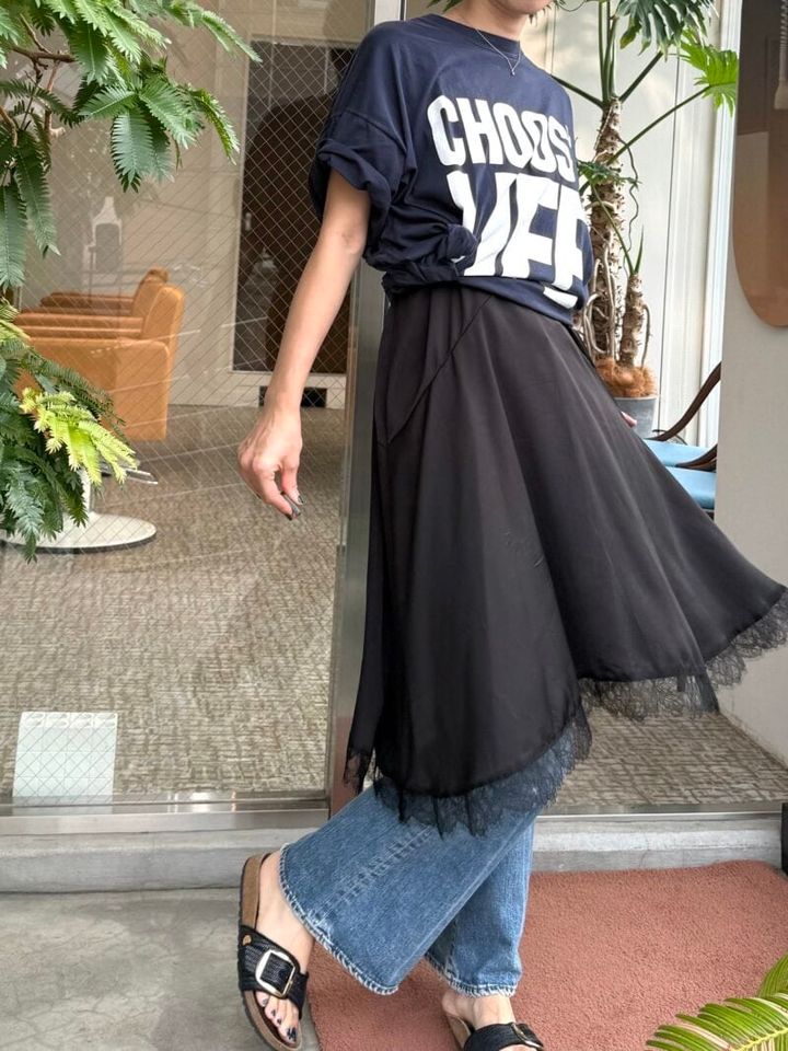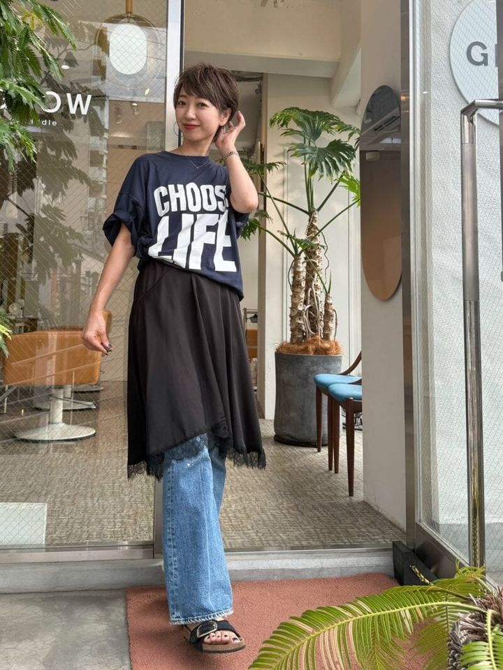 「女度の高い黒キャミレースワンピを、デニムパンツに重ねて今年っぽいレイヤードスタイルに。さらにロゴTシャツをプラスして、ネイビーのアイテムでサンドイッチ♪ カジュアルアイテムのTシャツは、ネイビーを選ぶと落ち着いた雰囲気にまとまるので、よく使います。レイヤードスタイルは全体のバランスがとりづらいので、Tシャツの裾の片側を結び、袖もロールアップしてすっきり見せました」(美容師 丸岡奈央さん)