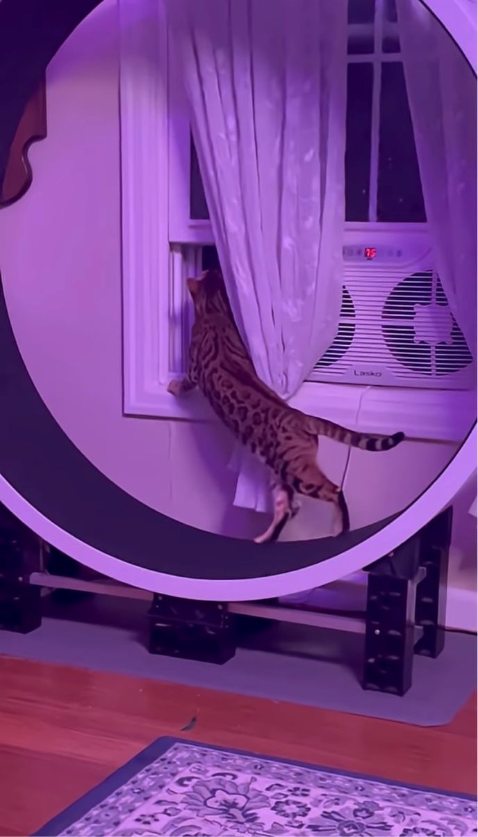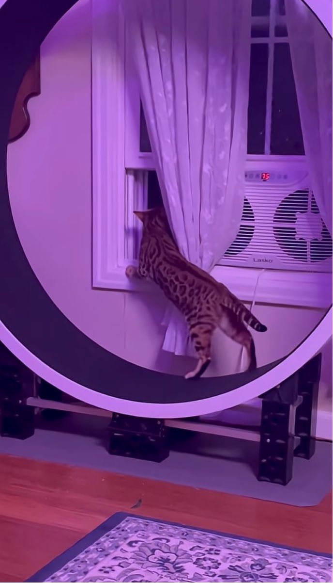 キャットホイールでウォーキング中の猫。だけど窓の外も気になって身を乗り出す!?【アメリカ・動画】