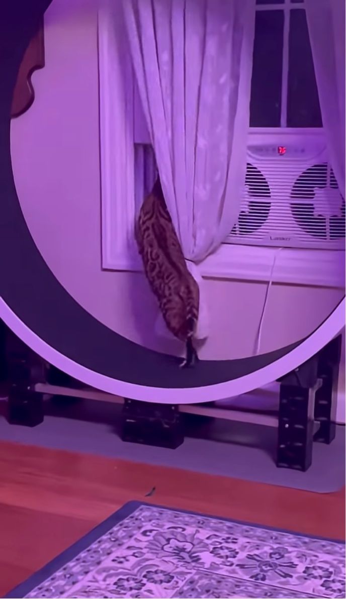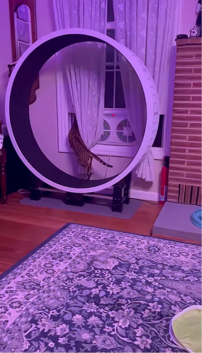 キャットホイールの上で運動中のネコ。 軽やかに歩いていますが、同時に「あること」にも集中していました!