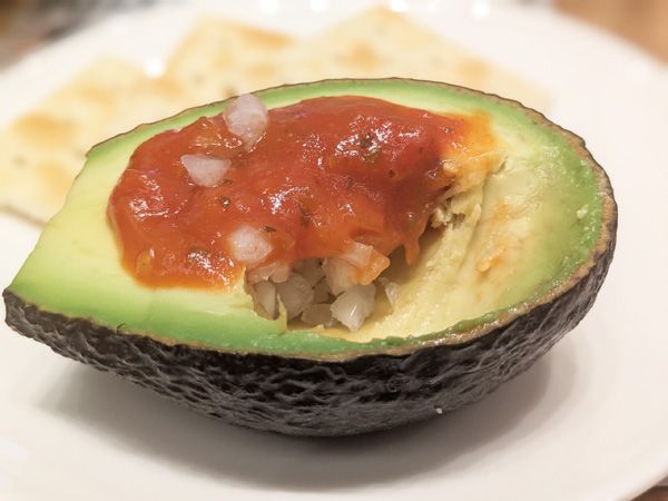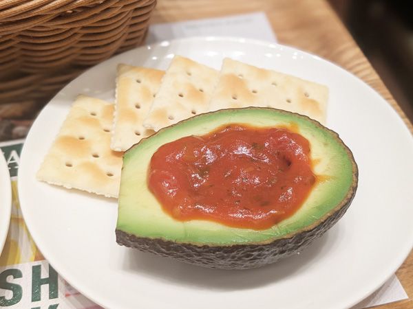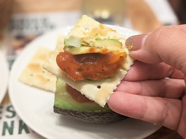 店内で半分にカットしたアボカドに、サルサソースがたっぷりイン。クラッカーにのせていただきます。