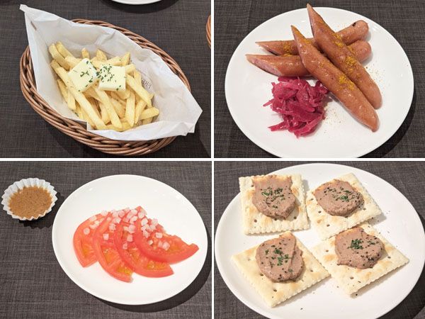 (左上から右回りに)ガーリックポテト、カリーブルスト、レバーペースト、トマトサラダ
