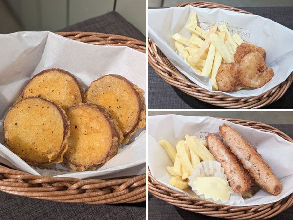 (左から右回りに)スモークチーズフライ、ガーリックシュリンプ&ポテト、フィッシュ&ポテト