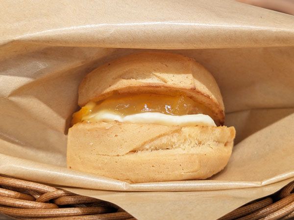 注文を受けてからカットし、グリドルでリベイク。酸味が特徴の北海道産クリームチーズと、砂糖不使用のフルーツジャムをサンドしてあります。