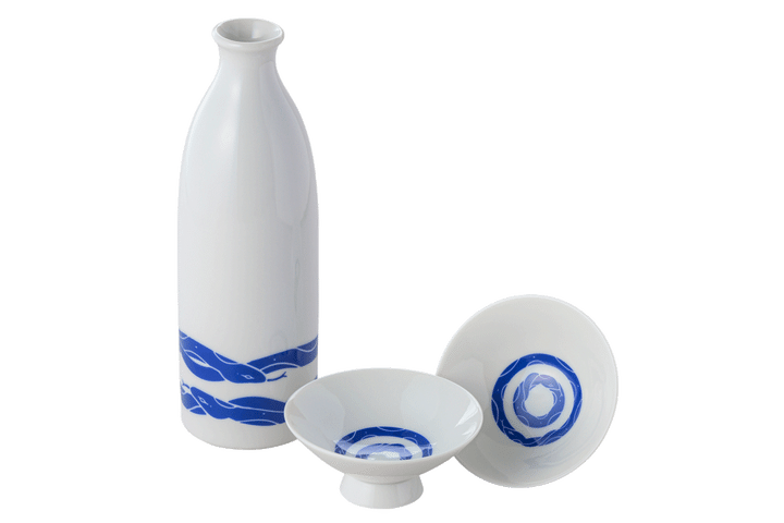旬の食材が最も豊富な季節の到来とともに、おいしい日本酒も完成するこの時期。いつもよりお酒を嗜みたくなる、そんな季節にぴったりな徳利とお猪口のセットは、農作業着をメインに手がける〈カイメン〉が展開。一見お馴染みの蛇目模様、しかしよく見ると二重丸の中に蛇が潜む、遊び心あふれるデザインとなっている。