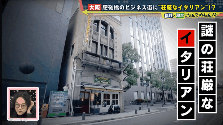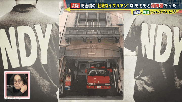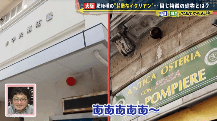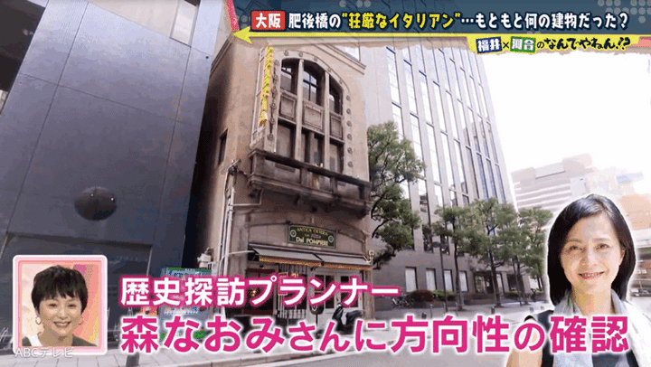 歴史探訪プランナーの森なおみさんによると、ダルポンピエーレの建物は「1925年に建てられた」そうで、「同じ用途の建物が日本各地に現存している」とのこと。そこで森さんは、「堺筋本町にまず行ってください」「半径700メートルほど歩けば、あのイタリアンと同じ特徴を持つ建物が見つかります」と、NDYにアドバイスした。