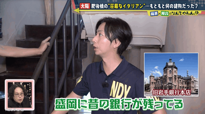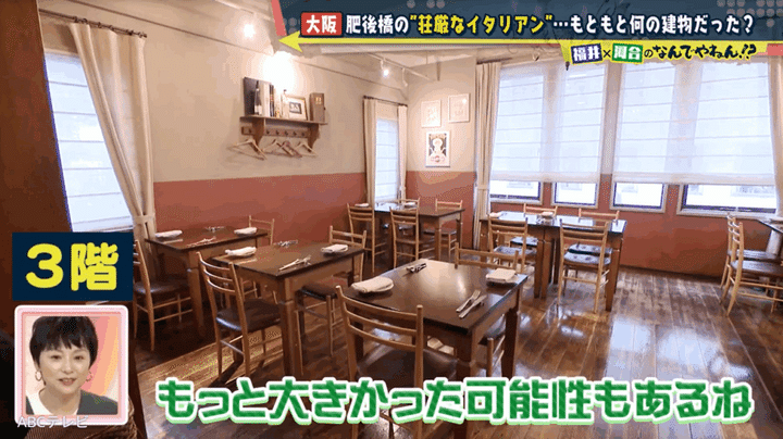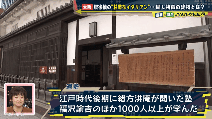 ヒントの範囲が非常に広いため、「レトロな建物は北浜にあるイメージ」という福井アナの一言で、NDYは堺筋本町の北側を調査開始。その中で2人は、江戸時代後期に蘭医学者の緒方洪庵が開き、福沢諭吉ら著名人たちを輩出した私塾「適塾」を発見した。適塾には、軒切り(道路拡幅事業)で縮小した過去があり、福井アナは「イタリアンの建物も昔はもっと広く、隣の私塾とつながっていた」と考えた。