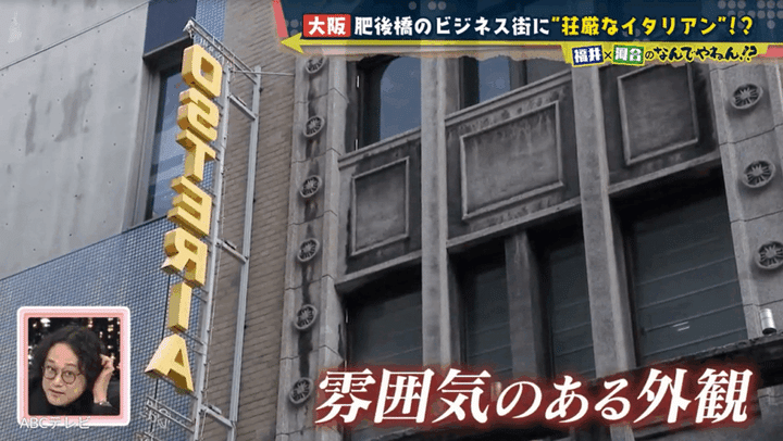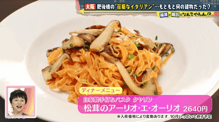 謎の“荘厳なイタリアン”とは、肥後橋駅(大阪メトロ四つ橋線)と淀屋橋駅(大阪メトロ御堂筋線/京阪本線)の中間地点にある「ANTICA OSTERIA Dal POMPIERE(アンティカオステリア ダルポンピエーレ)」のこと。手打ちパスタが絶品で、NDYことタレントの河合郁人とABCテレビの福井治人アナウンサーのコンビは、タヤリン(黄身が赤い卵の卵黄だけを使ったパスタ)と松茸のアーリオ・エ・オーリオに感激した。
