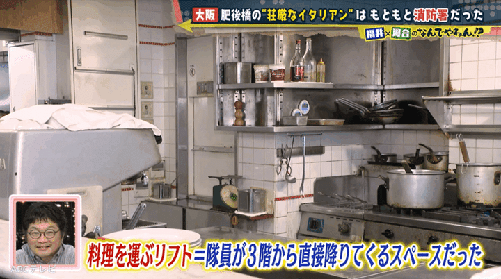 NDYがとにかく歩き回って推理した結果は、100点満点中……なんと0点! 彼らがたどり着かなければならなかったのは、堺筋本町の南北ではなく、東西の本町通にある消防署。つまりダルポンピエーレの建物は、かつて消防署だった。2つの共通点は、赤色灯と非常に高い天井で、森さんいわくダルポンピエーレの建物1階の天井が高いのは、「(かつてあそこは)車庫で、消防車を入れるために吹き抜けにしていた名残」だからだ。