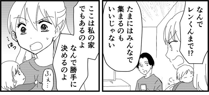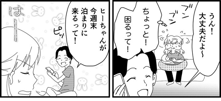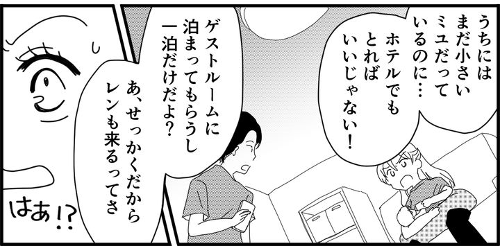 2人がなんだかんだと話しているのを横目に、私は娘にミルクをあげ始めました。すると、なんだか嫌な予感が……。どうやらわが家に泊まりに来たいという話のようです。