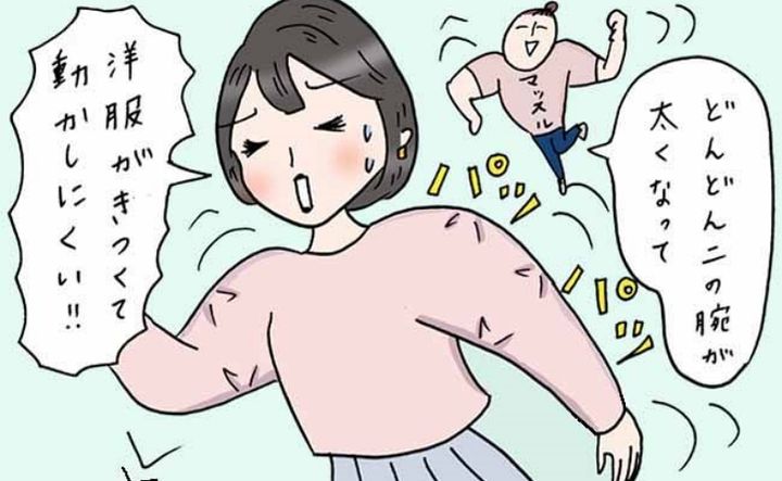 おかしいなと思って体重を測ってみても、出産前とさほど変わっていないのでかなり驚きました。体重はあまり変わっていないのに、抱っこばかりの育児のおかげで二の腕だけが鍛えられて、両腕の筋肉がモリモリついて、がっちりとたくましくなってしまったのです。