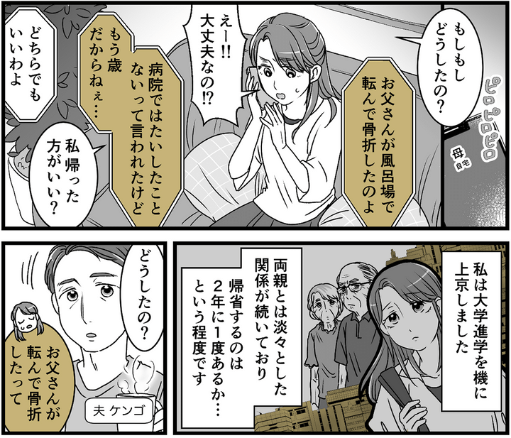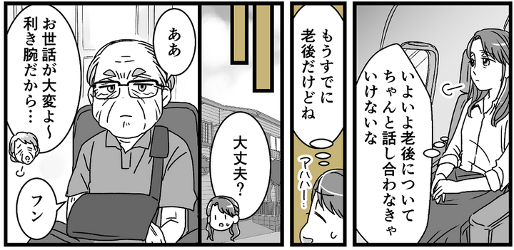 父が風呂場で転倒し骨折したという連絡を受け、私は久しぶりに実家へ帰省することに。それを機に両親と施設への入所など今後の話をしようとしますが、父は激昂し、母もまともに取り合いません。私は過去にも両親から老後の話を拒否されてきました。
