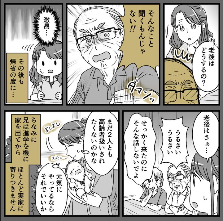 10年ほど前に父に老後について話を振ったことがあります。でも父は激昂し、当時の私は子育てで忙しかったので、まあ元気にやっているならそれでいいかと、すぐに引き下がったのです。ちなみに兄は進学を機に家を出てから、ほとんど実家に寄りつきません。