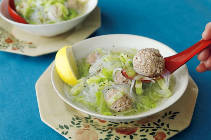 鍋に残した肉だんごとゆで汁に〈A〉を加え、中火で煮立てる。春雨、キャベツ、しょうがを加え、再び煮立ったら弱火にし、5分ほど煮る。器に盛り、好みでレモンを添えて、絞って食べる。